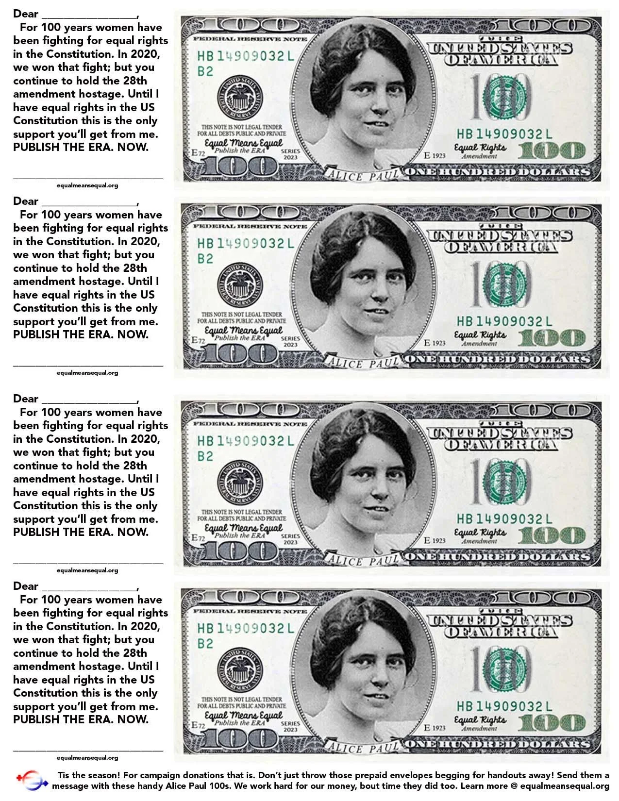13. Instead of just trashing campaign donation envelopes, print & keep handy these Alice Paul ERA Dollars & return one in the envelopes with a message!